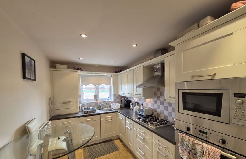 A modern fitted kitchen complements the living space, offering practicality and contemporary design.