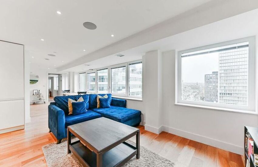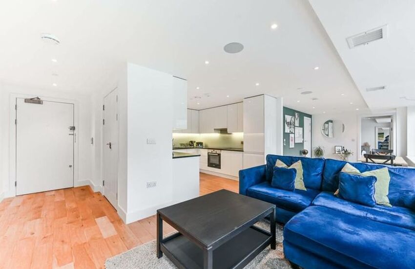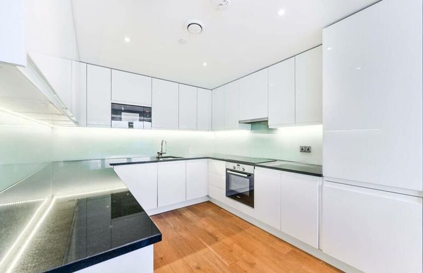The apartment features a sleek high-gloss kitchen seamlessly opening into a generous lounge/diner, creating a bright and contemporary living space ideal for modern lifestyles.