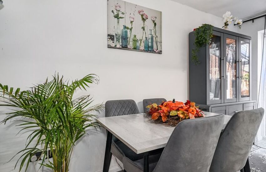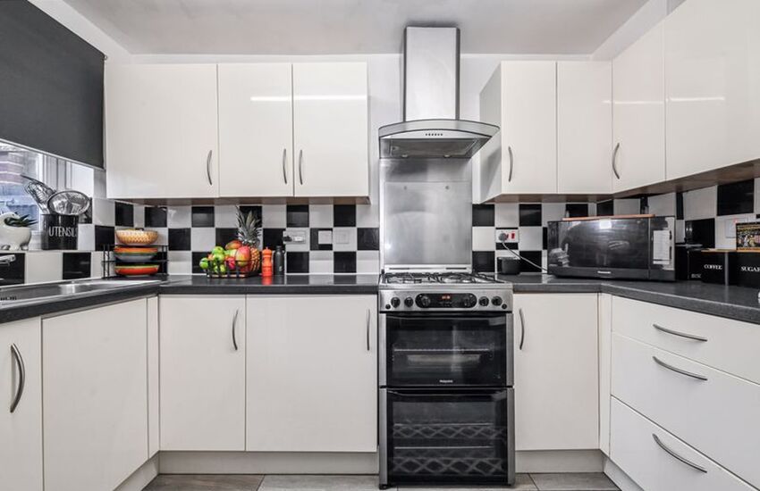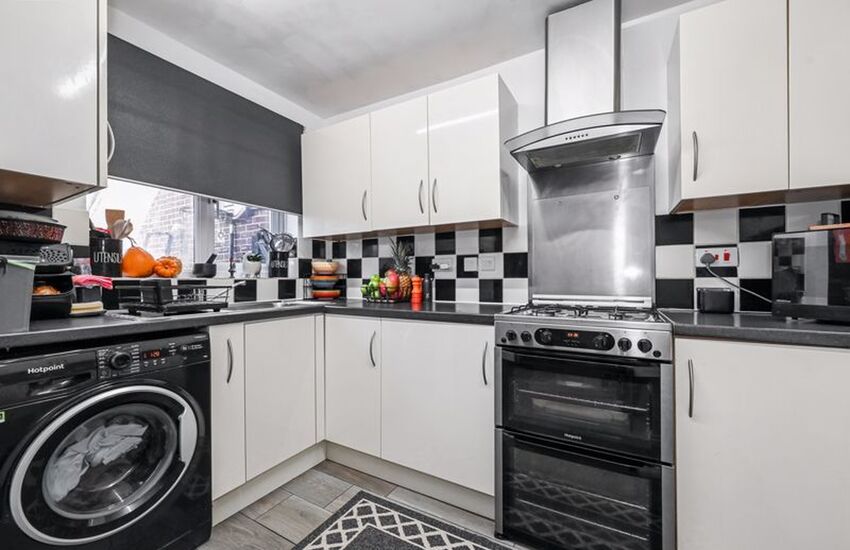 The modern fitted kitchen seamlessly opens to a bright dining area, creating a sociable and contemporary space.Â